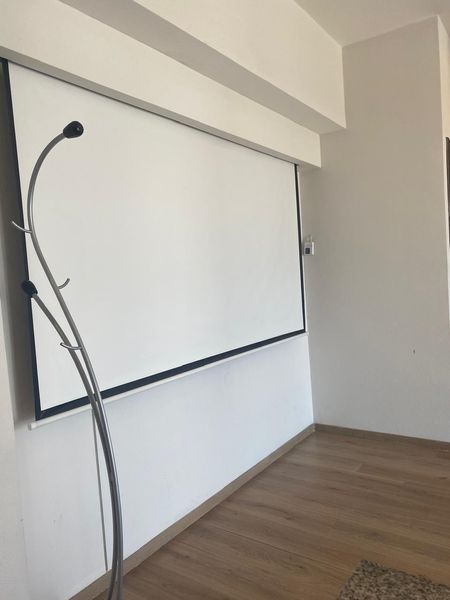 Sala equipada con pantalla para proyector, ideal para quienes quieran invertir en proyectos Arb & B, chapa digital, apagadores digitales con conexión wifi.