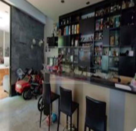 Planta baja: Sala comedor, medio baño, área de bar, estudio, cocina, área de lavado, cuarto de servicios con baño y garaje.