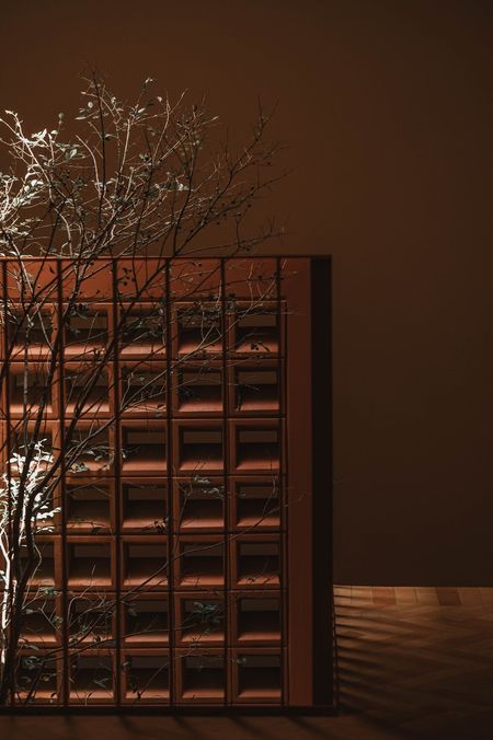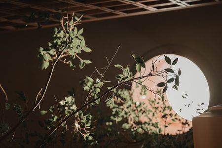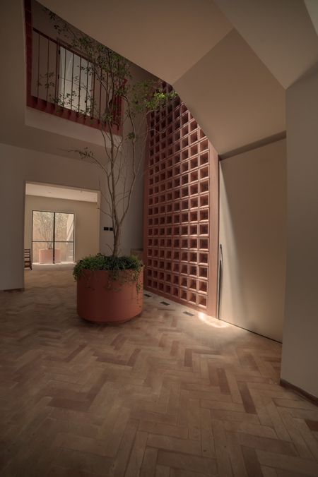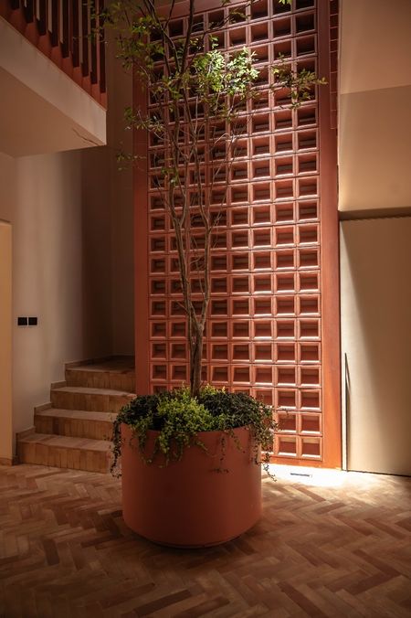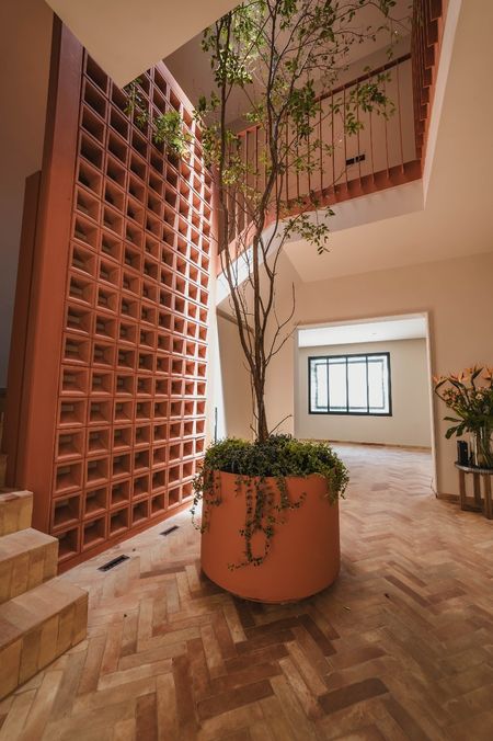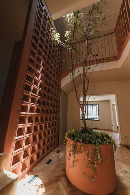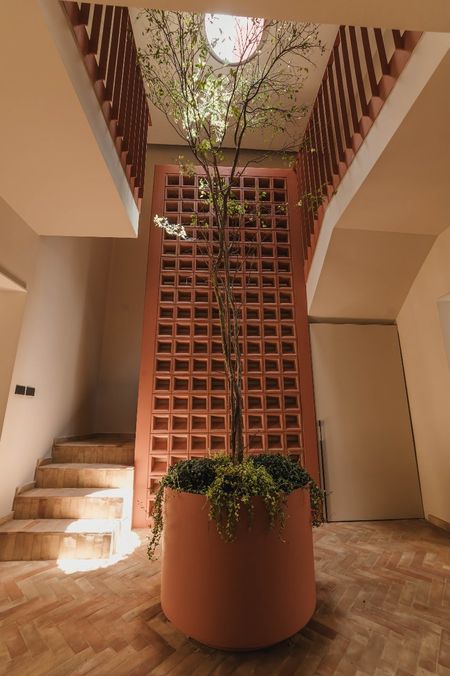 Recibidor de doble altura con un árbol arrayán al centro como elemento de diseño.