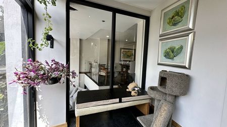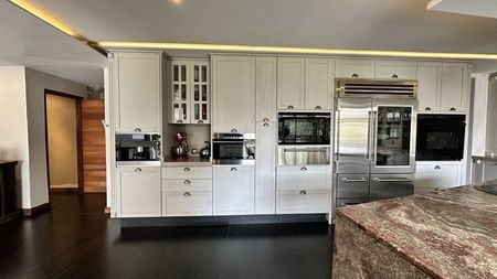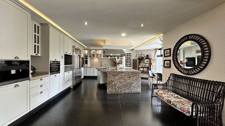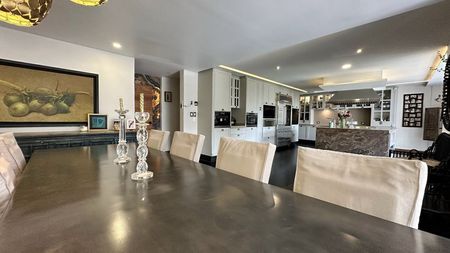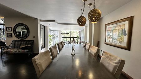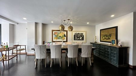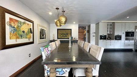 Cocina abierta con isla y desayunador, amplio comedor, sala en desnivel con terraza privada y hermosa vista verde