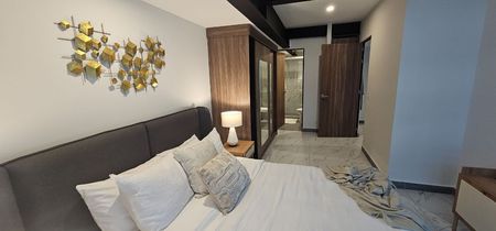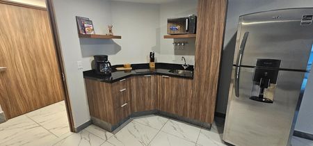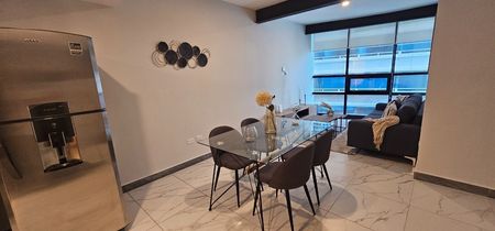 El departamento se entrega equipado con elegantes acabados, refrigerador, horno de microondas, parrilla eléctrica, lavasecadora y persianas