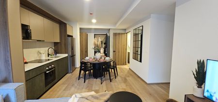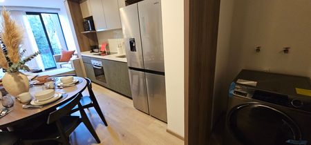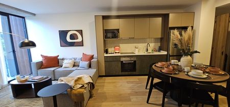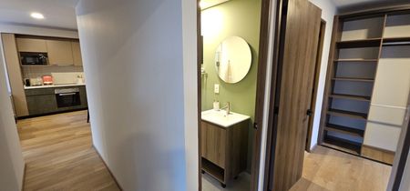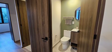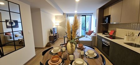 Se entrega equipado con refrigerador, horno de microondas, centro de lavado, horno convencional, estufa de 4 parrillas y persianas