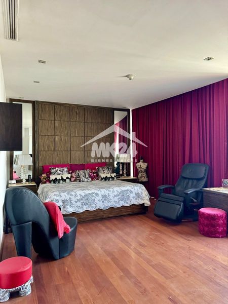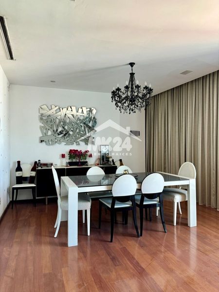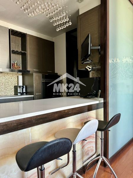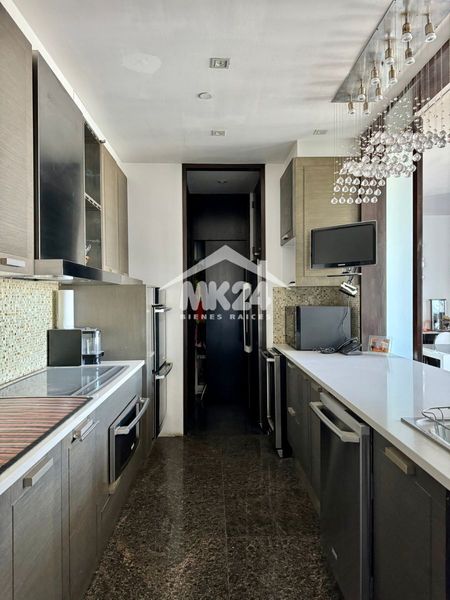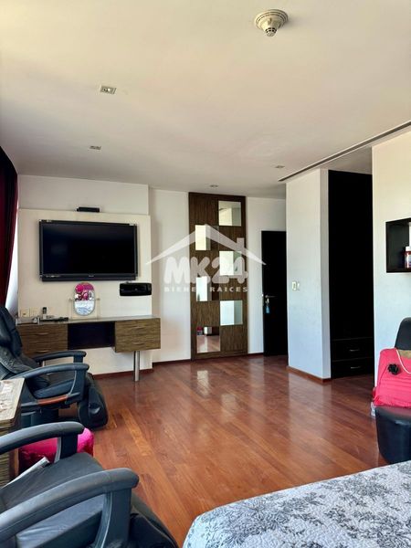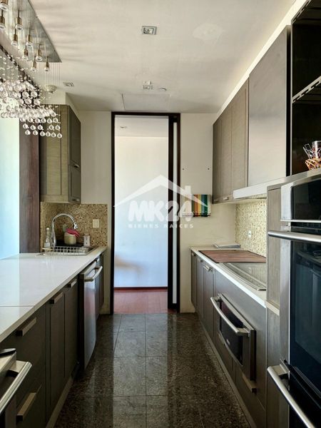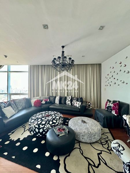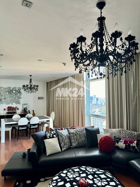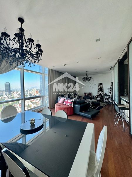 Hermoso departamento amueblado y equipado con hermosas vistas a la Ciudad de México. Consta de sala comedor, cocina integral equipada (refrigerador, lavavajillas), barra desayunador, medio baño de visitas, tres recámaras amplias, cada una con baño completo. La recámara principal con walk in closet. Sala de TV amueblada, cuarto de servicio integrado con baño completo y cuatro estacionamientos fijos y techados.