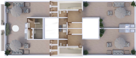 Cuenta con ocho departamentos: dos con terraza y seis con balcón, de los cuales dos tienen Roof Garden privado. Además cuenta con un Roof Garden de uso común, estacionamientos de uso exclusivo, elevador y caseta de vigilancia.