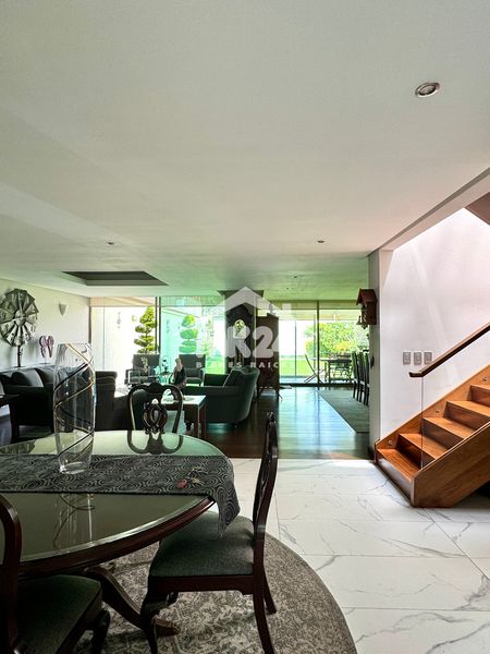 En planta baja se encuentra un gran hall recibidor, amplia sala y comedor con vista al gran jardín y su terraza techada, cantina bar, preciosa cocina integral con antecomedor y gran alacena, medio baño de visitas y bodega. El cuarto de servicio con baño completo y lavandería se encuentran al fondo del jardín.