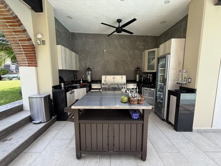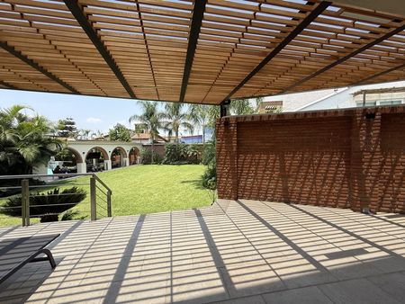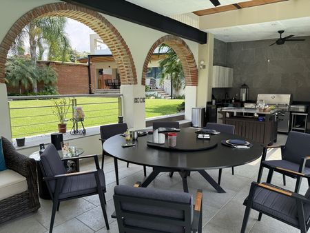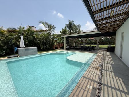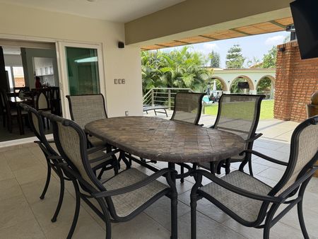 en el área de jardín y alberca hay otra terraza con palapa y asador, 2 medio baños con lavamanos exterior, regadera externa, cisterna.