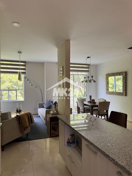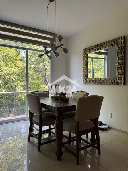En el primer nivel se encuentra la sala y comedor con acceso al balcón con hermosas vistas arboladas, cocina integral abierta con barra desayunador, dos amplias recámaras, la principal con vestidor y baño completo con ventilación natural, y la segunda recámara muy amplia también, con closet y baño completo afuera, con ventilación natural, cuarto de lavandería muy amplio.