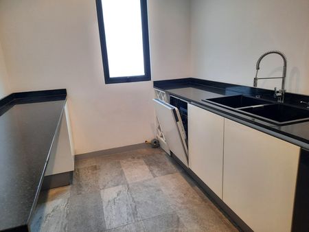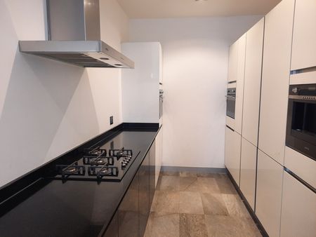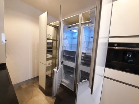 Cocina cerrada, con refrigerador y lava vajillas en páneles ocultos, cafetera, horno, barra para desayunar.