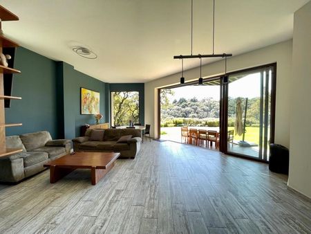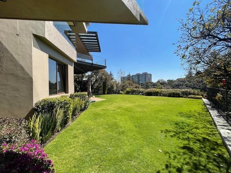 El área social se extiende al jardín principal, que tiene aproximadamente 320 m2 de superficie. Hay escaleras que descienden hacia una terraza con un área de aproximadamente 110 m2. La terraza tiene capacidad para 12 personas y ofrece acceso al jardín, ambos orientados al sur. Además, en esta área se encuentra una recámara secundaria con closets y baño completo, que puede funcionar de manera independiente para las visitas. También hay una toilette para visitas y un amplio salón para usos múltiples.