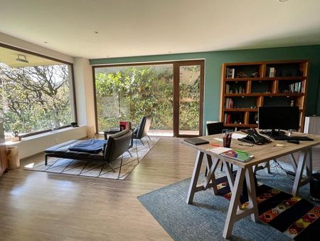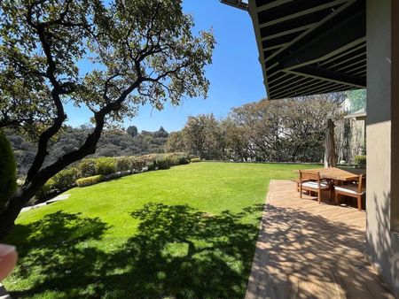 Hermosa casa en venta ubicada en Tepozcuautla Cumbres de Santa Fe, rodeada de un exuberante bosque. La fachada principal de la casa está orientada al sureste, ofreciendo vistas impresionantes a la cañada, mientras que la fachada de acceso se encuentra en el noreste.