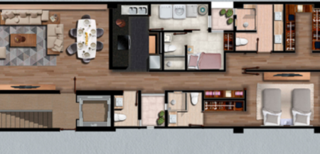 Dos recámaras, dos baños y medio, cocina, sala de estar, patio, terraza, baño y cuarto de servicio, área de lavado y dos cajones de estacionamiento.
