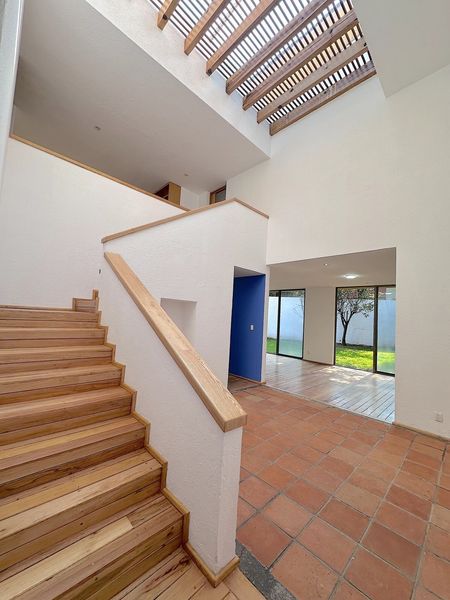 La casa está diseñada para aprovechar al máximo cada espacio y ofrecer un ambiente cálido y funcional. En la planta baja, el recibidor da una cálida bienvenida. La sala y el comedor rodean un hermoso patio central con triple altura y un tragaluz que llena de vida y energía el corazón de la casa. La cocina es práctica y funcional, con suficiente espacio de almacenamiento y acceso directo a las áreas de servicio y estacionamiento, pensado para mantener la privacidad en el hogar.