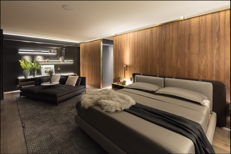 El área privada es un santuario personal de lujo, con pisos de cálida madera de Nogal: