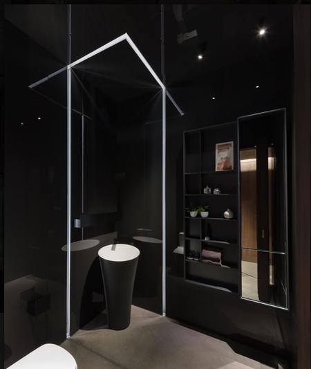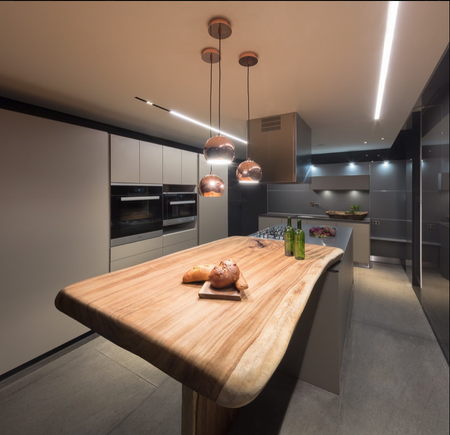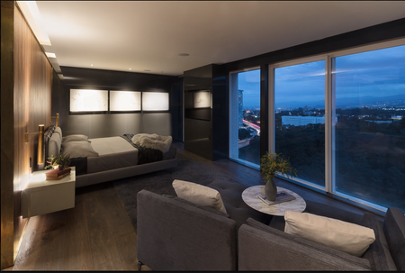 Acabados de Lujo: Los pisos de las áreas sociales destacan por la elegante Piedra Basaltina y el pulcro piso de piedra negra en la sala-comedor. Los contrastes se logran con muros en madera laqueada al alto brillo y espejos grises. Un plafón de suede con color enfatiza la circulación principal.