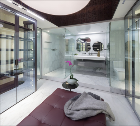 Recámara Principal: Un retiro de luz y amplitud. Incluye dos amplios vestidores con acabados Rimadesio y dos baños completos de lujo, revestidos en exquisito mármol Calacata, ofreciendo el máximo confort y privacidad.