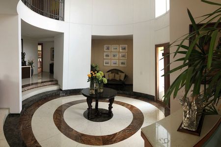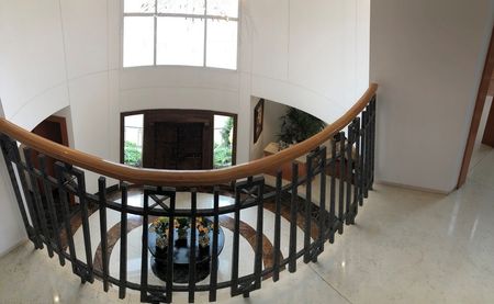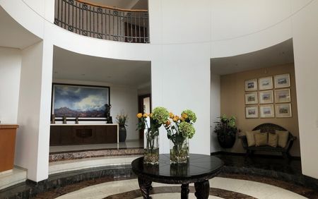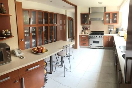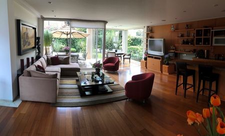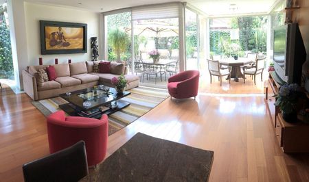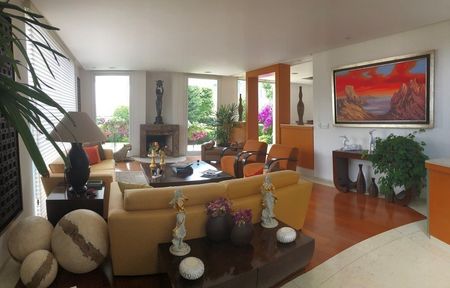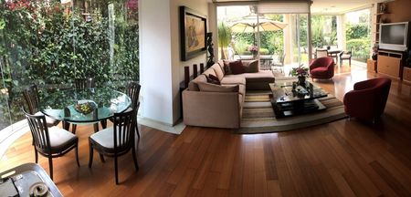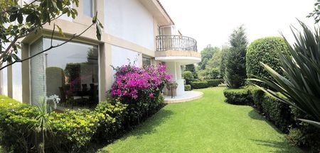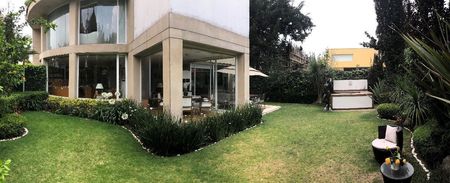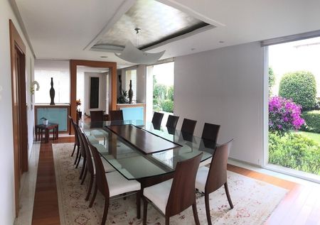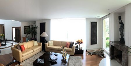 Consta de recibidor, sala y comedor con salida al jardín, antecomedor, salón de juegos con salida a un segundo jardín con terraza, medio baño, estudio, sala de tv, 4 recámaras, cada una con baño y vestidor, gimnasio con jacuzzi y sauna. Dos cuartos de servicio, cuarto de choferes con baño, 6 estacionamientos techados y bodega.